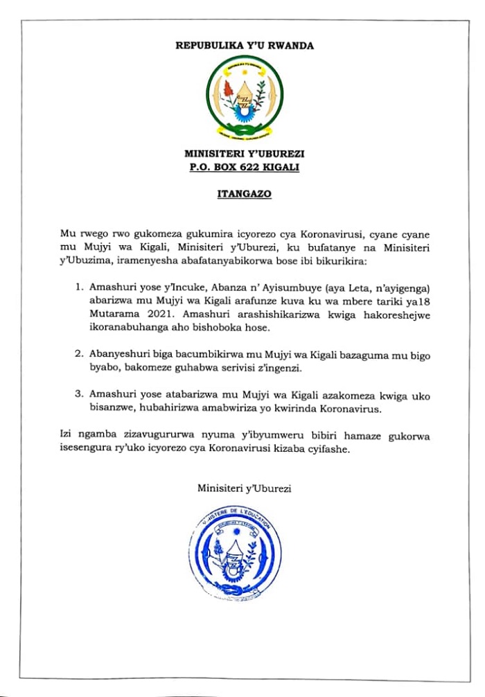 Mu itangazo MINEDUC yagize iti "Amashuri yose y’Incuke, Abanza n’Ayisumbuye(aya Leta n’Ayigenga) abarizwa mu Mujyi wa Kigali arafunzwe guhera ku wa Mbere tariki 18 Mutarama 2021. Amashuri arashishikarizwa kwiga hakoreshejwe ikoranabuhanga aho bishoboka hose."