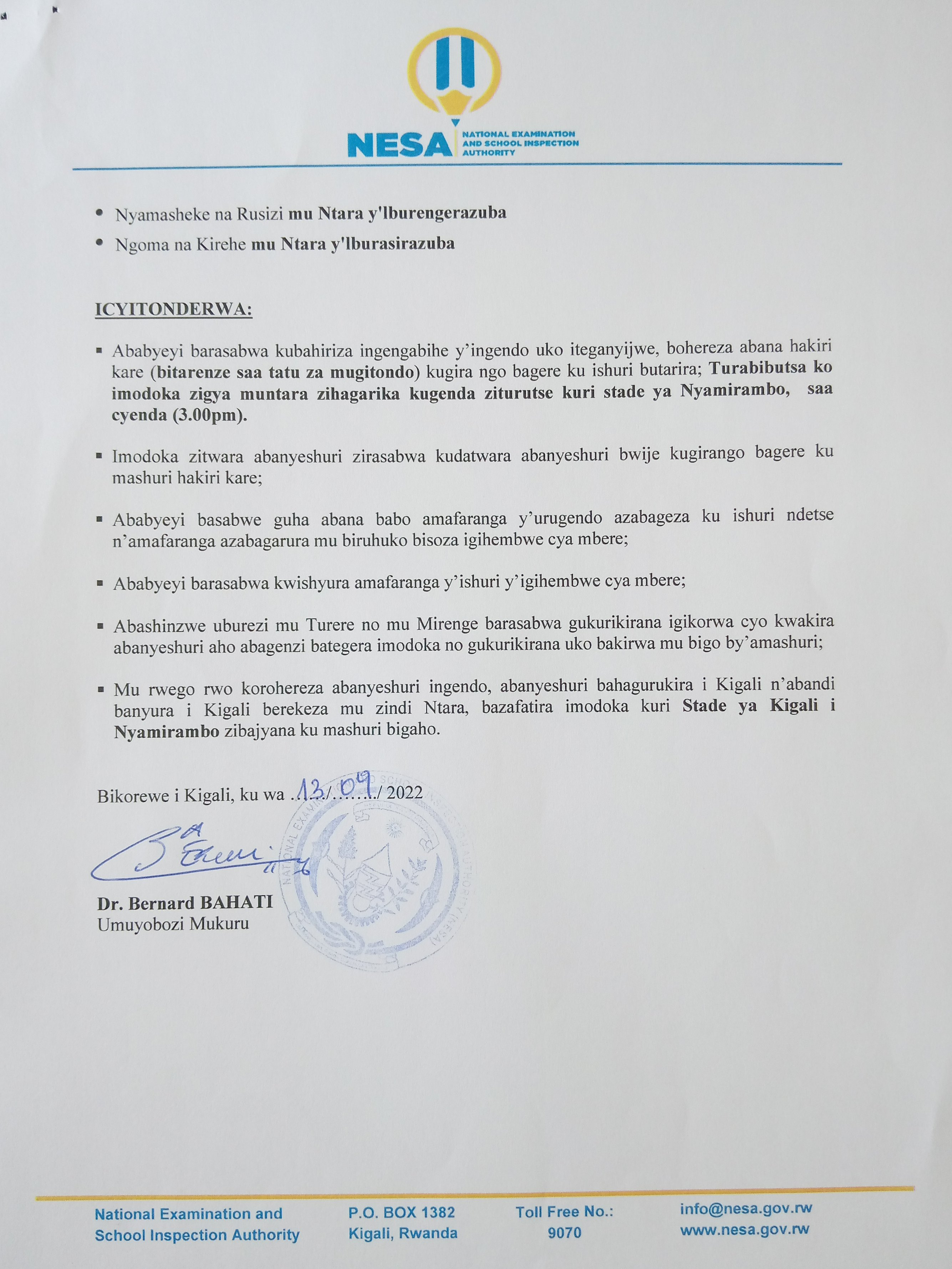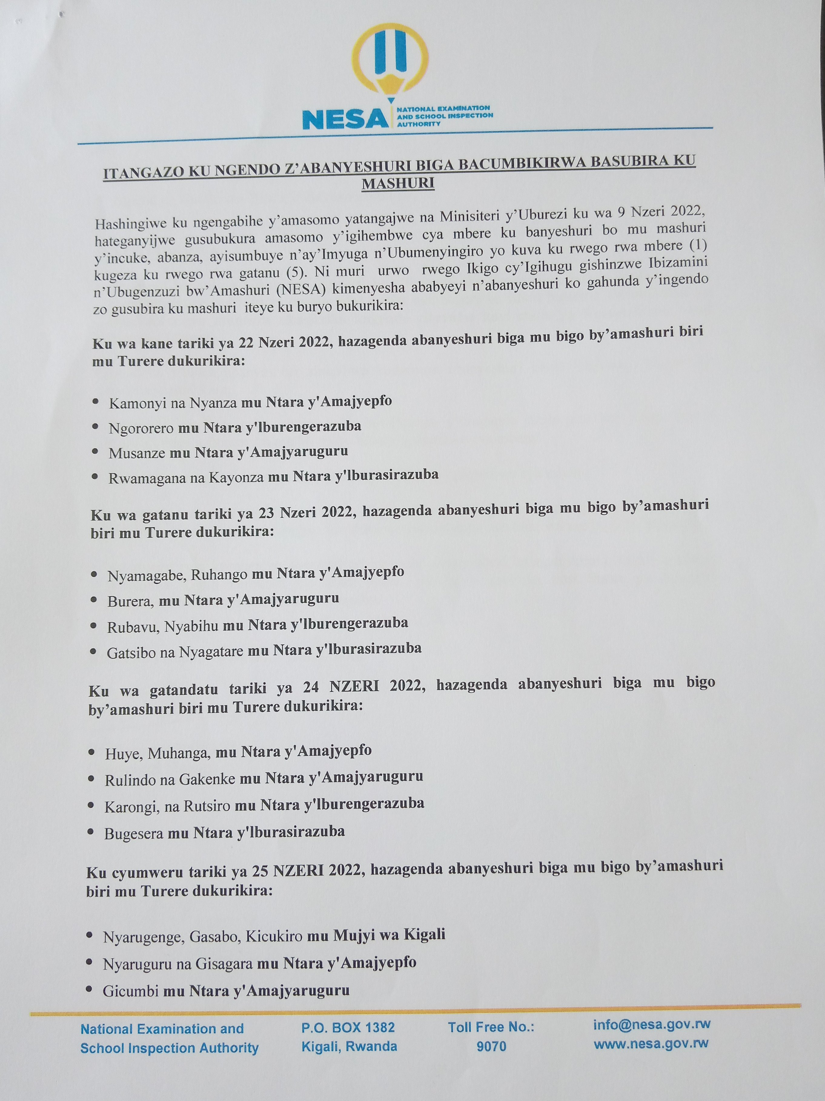 Itangazo NESA yashyize ahagaragara riragira riti “Dufatanyije n’abafatanyabikorwa bacu barimo RURA, RBC, RNP, ATPR, RITCO, JALI HOLDINGS na RFTC twiteguye gutangira gufasha abanyeshuri kujya ku ishuri kuva tariki 22 kugera tariki 25 z’uku kwezi”.