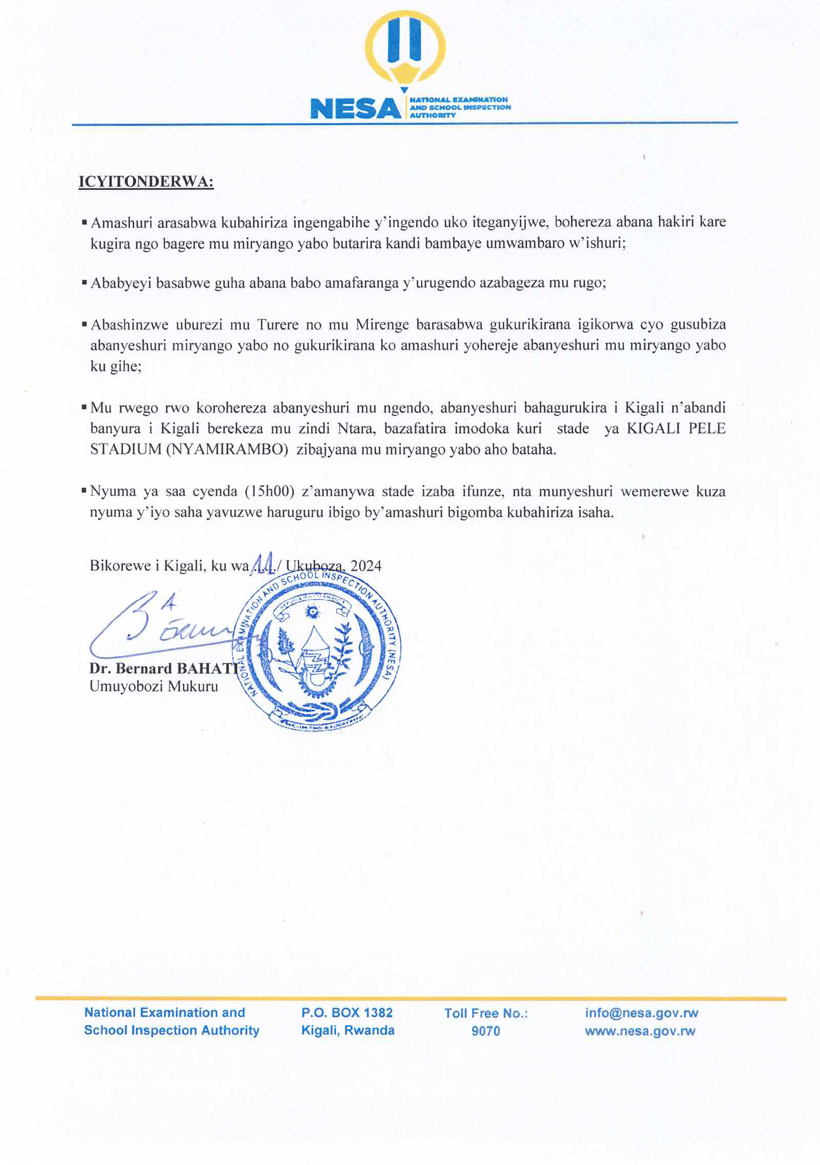 Hashingiwe ku ngengabihe y’amasomo n’igihe cy’ibiruhuko by’abanyeshuri yatangajwe na Minisiteri y’Uburezi, Ikigo cy’igihugu gishinzwe Ibizamini n’Ubugenzuzi bw’Amashuri (NESA) kiramenyesha abayobozi b’amashuri, abarezi ndetse n’ababyeyi ko abanyeshuri biga bacumbikirwa bazatangira gusubira mu miryango yabo mu kiruhuko guhera tariki 19 kugeza tariki 22 Ukuboza 2024.
