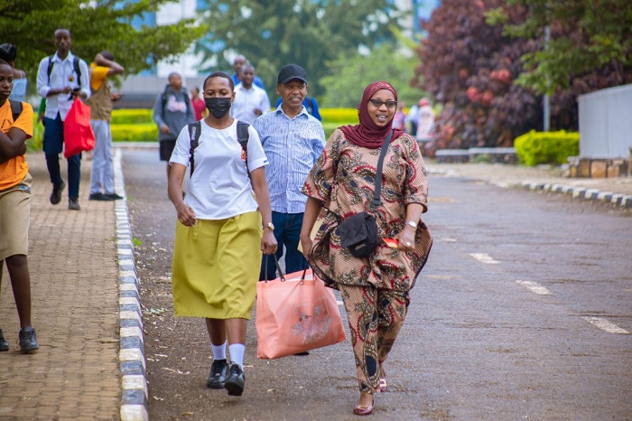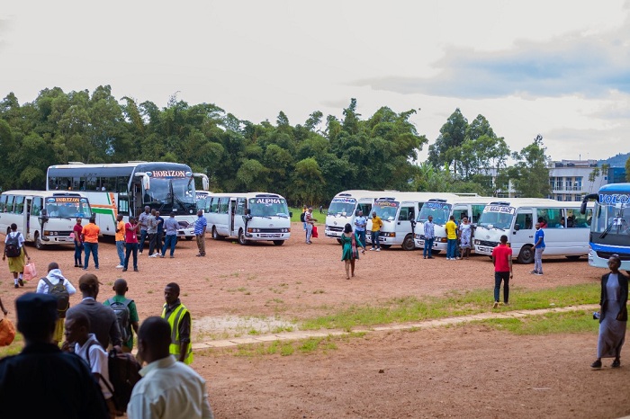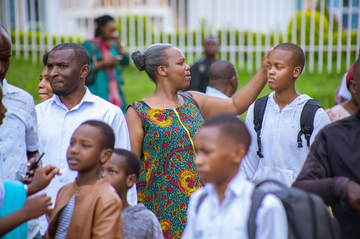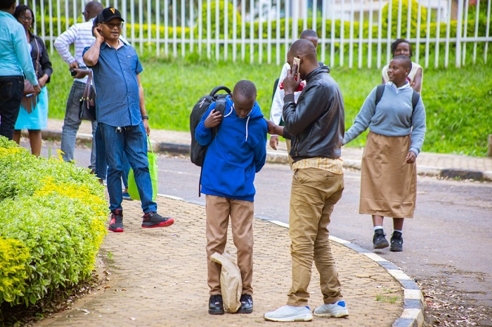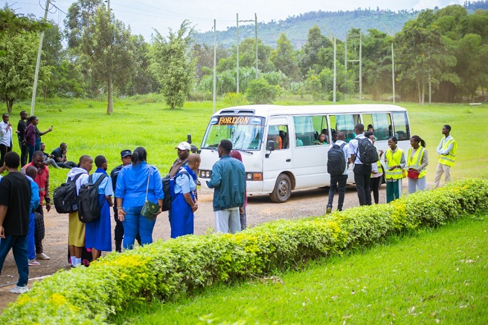 Aho abanyeshuri bafatira imodoka, bari baherekejwe n’ababyeyi babo, ku buryo gusezeranaho wabona bitoroshye kubera amarangamutima.