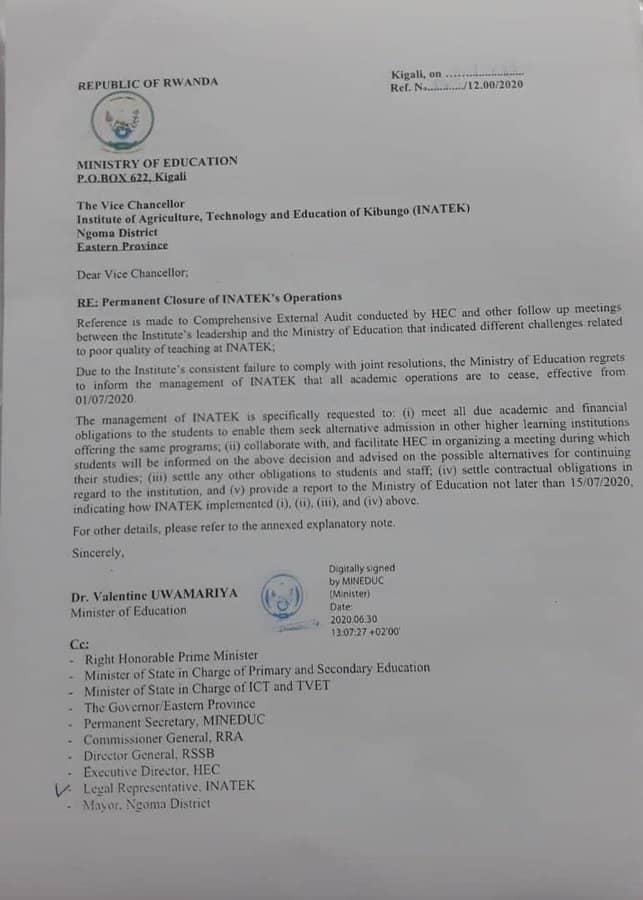 Muri iyo baruwa, Minisiteri y’Uburezi yavuze ko iyo kaminuza yananiwe gutanga uburezi bufite ireme, ikaba ari yo mpamvu yafunzwe, imirimo yayo yose yahise ihagarikwa guhera ku itariki ya 01 Nyakanga 2020.