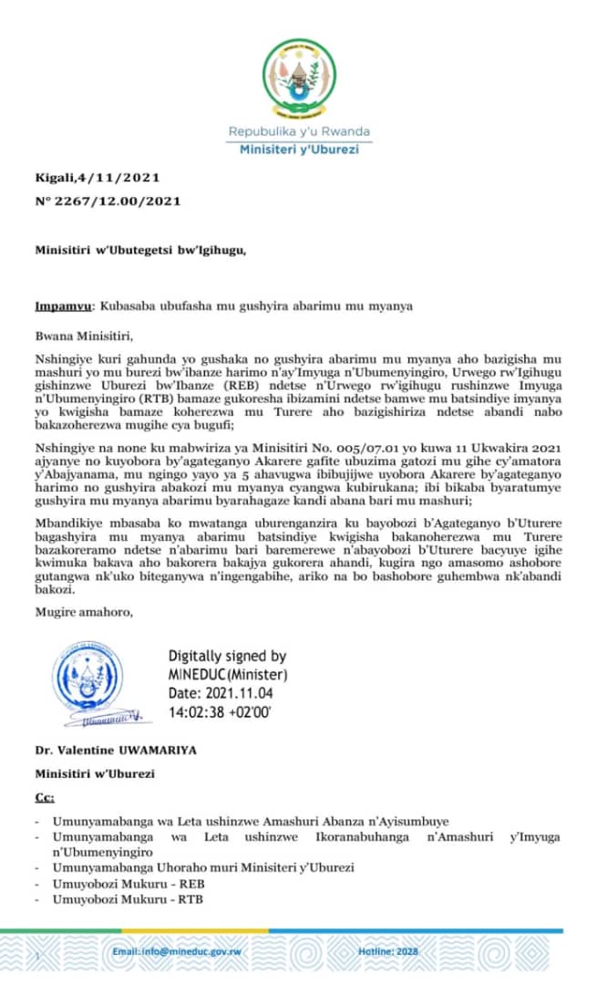 Ibaruwa yashyizweho umukono na Minisitiri w’Uburezi, Dr. Valentine Uwamariya iragira iti: "Nshingiye kuri gahunda yo gushaka no gushyira abarimu mu myanya aho bazigisha mu mashuri yo mu burezi bw’ibanze harimo n’ay’Imyuga n’Ubumenyingiro, Urwego rw’Igihugu rushinzwe Uburezi bw’Ibanze (REB) ndetse n’Urwego rw’igihugu rushinzwe Imyuga n’Ubumenyingiro (RTB) bamaze gukoresha ibizamini ndetse bamwe mu batsindiye imyanya yo kwigisha bamaze koherezwa mu Turere aho bazigishiriza, abandi bakazoherezwa mu gihe cya bugufi."