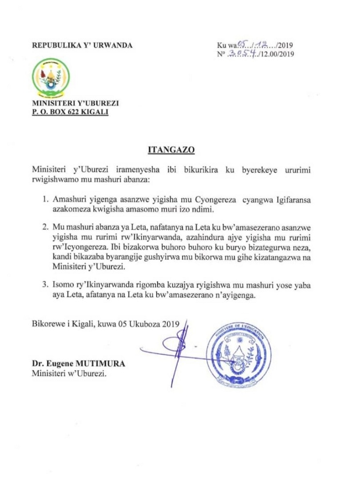 Iryo tangazo rikomeza rivuga ko isomo ry’Ikinyarwanda rigomba kuzajya ryigishwa mu mashuri yose yaba aya Leta, afatanya na Leta ku bw’amasezerano, n’ayigenga.