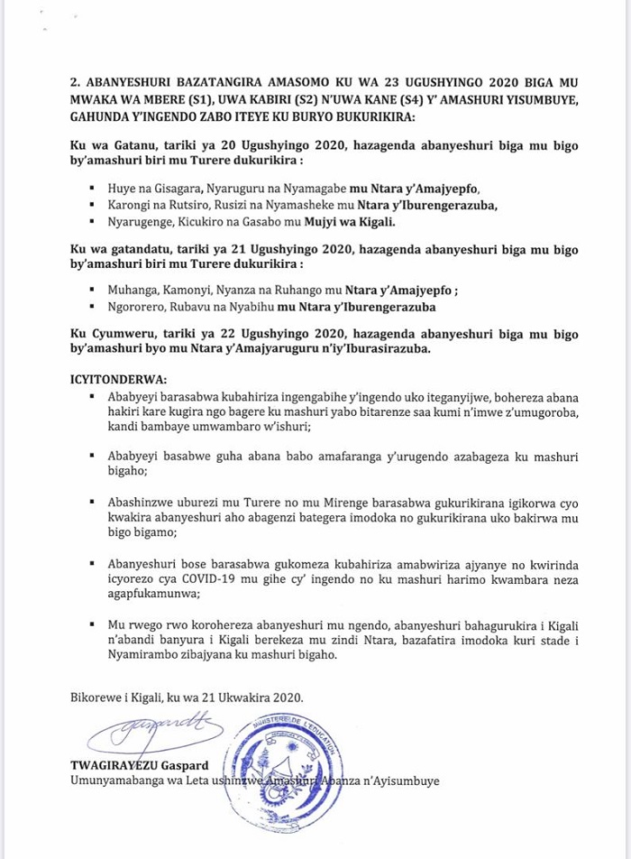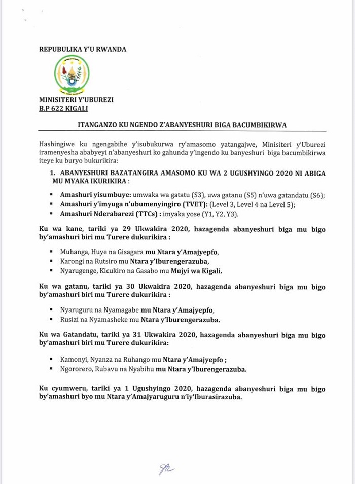 Nyuma y’uko mu minsi ishize hatangajwe ingengabihe y’isubukurwa ry’amasomo, ubu noneho Minisiteri y’Uburezi (MINEDUC) yashyize ahagaragara gahunda y’ingendo zo gusubira ku ishuri ku banyeshuri biga bacumbikirwa.