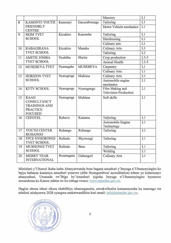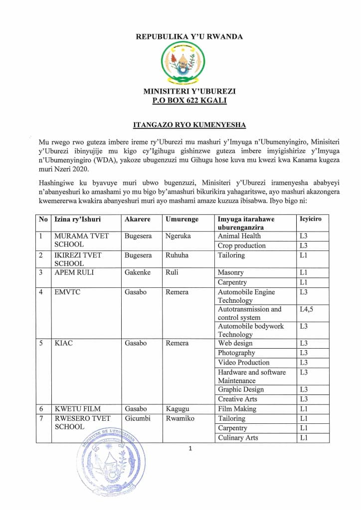 Amwe mu mashuri yafunzwe ni nka KIAC ryo muri Gasabo ryigishaga gukora amavidewo, Murama TVET School mu Bugesera, Rabagirana TVET School muri Kicukiro, KFTV muri Nyarugenge, CEFOTEL muri Rubavu, Youth Center Ruhango, Mushongi TVET School muri Rulindo n’andi.