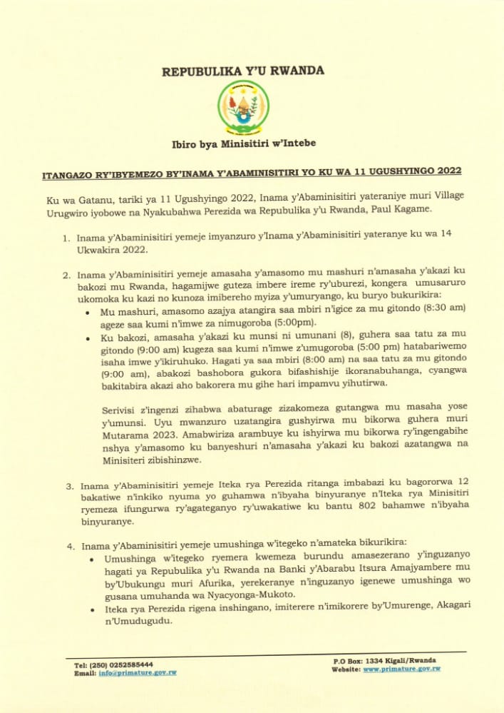 Itangazo ry’ibyemezo by’Inama y’Abaminisitiri ryasohotse tariki 11 Ugushyingo 2022, rivuga ko mu mashuri amasomo azajya atangira saa mbili n’igice za mugitondo ageze saa kumi n’imwe za nimugoroba.