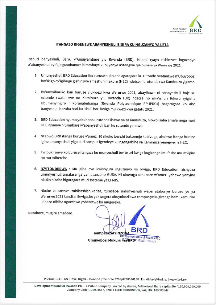 Banki y’Amajyambere y’u Rwanda (BRD), ishami ryayo rishinzwe inguzanyo z’abanyeshuri, yageneye abanyeshuri bigira ku nguzanyo ya Leta itangazo ribasobanurira imitangire ya Buruse n’imikoreshereze yayo.