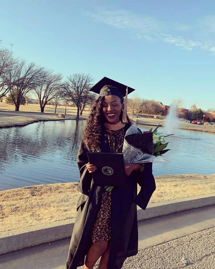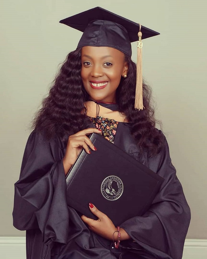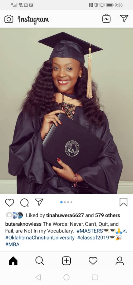 Mu mafoto Butera Knowless ubwe yishyiriye ku rukuta rwe rwa Instagram, yagaragaye yambaye ikanzu y’abasoje amashuri makuru, n’igitabo cyanditseho “Christian University of Oklahoma” kirimo impamyabumenyi.