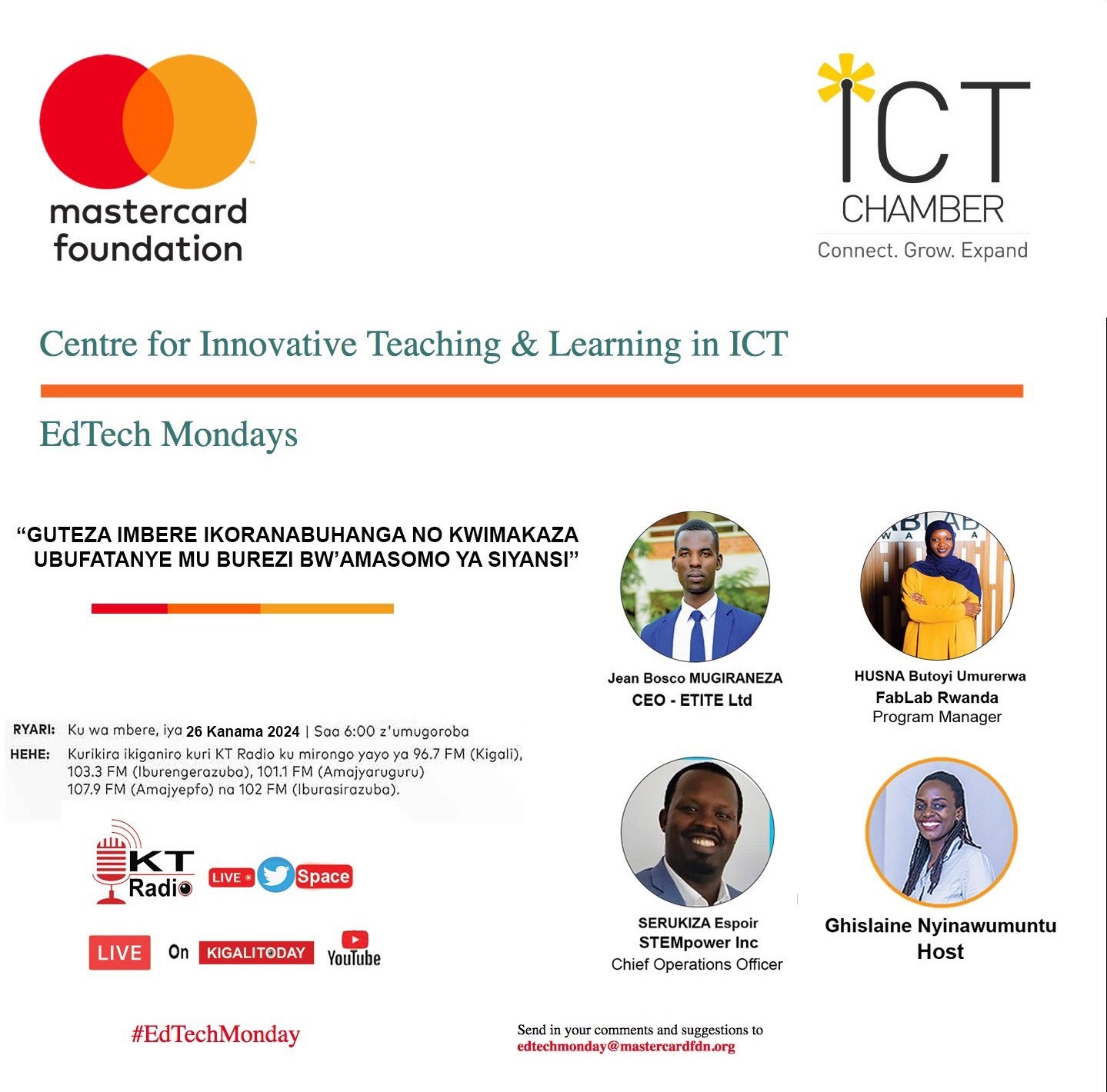 Ikiganiro EdTech Monday, igice cyo muri uku kwezi kwa Kanama kiratambuka mu Kinyarwanda kuri KT Radio kuva saa kumi n’ebyiri z’umugoroba kugeza saa moya (18h00-19h00), ndetse no ku muyoboro wa YouTube wa Kigali Today no kuri Space X yahoze yitwa Twitter.