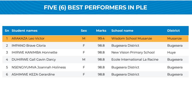 Minisiteri y’Uburezi yatangaje amanota y’Abana batandatu basoje amashuri abanza, aho ARAKAZA Leo Victor yabaye uwa mbere mu mashuri abanza n’amanota 99.4%, akaba yiga mu ishuri rya Wisdom School ry’i Musanze.
