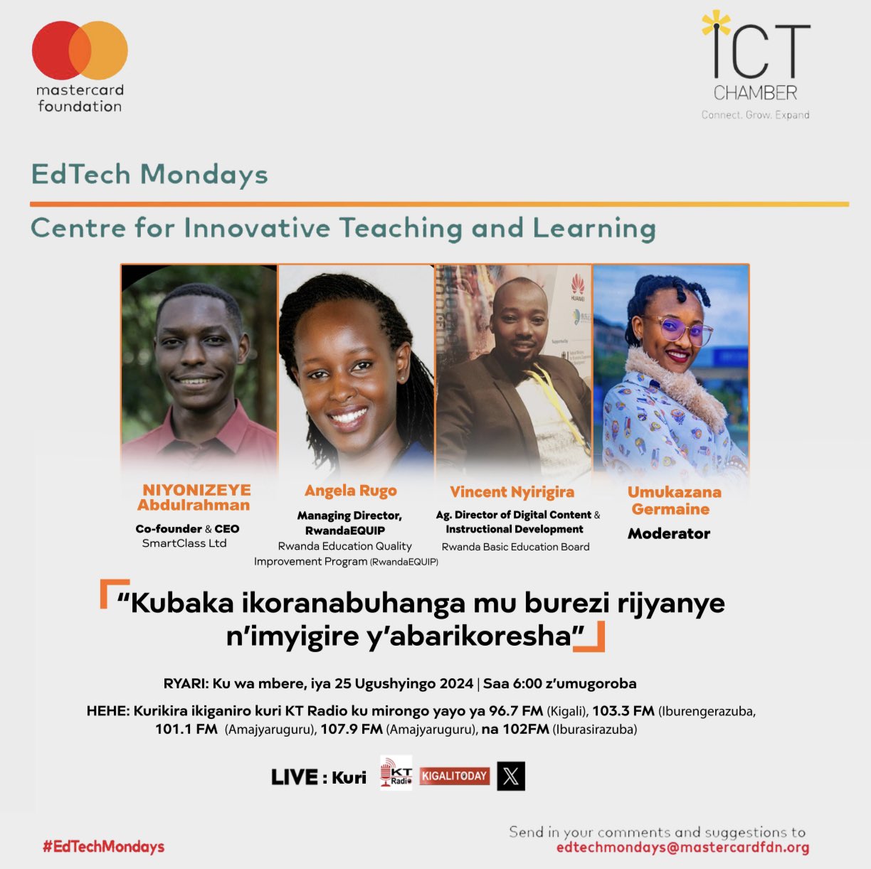 Mu kiganiro EdTech Monday cyo kuri uyu wa Mbere tariki 25 Ugushyingo 2024 abatumirwa bacu baratugaragariza uko hakwiye kubakwa ikoranabuhanga mu burezi, rijyanye n’imiterere y’abarikoresha, hagendewe ku muco gakondo n’ururimi benshi mu banyeshuri bazi gukoresha, mu rwego rwo guhuza ibikenewe n’ireme ry’uburezi ryifuzwa.