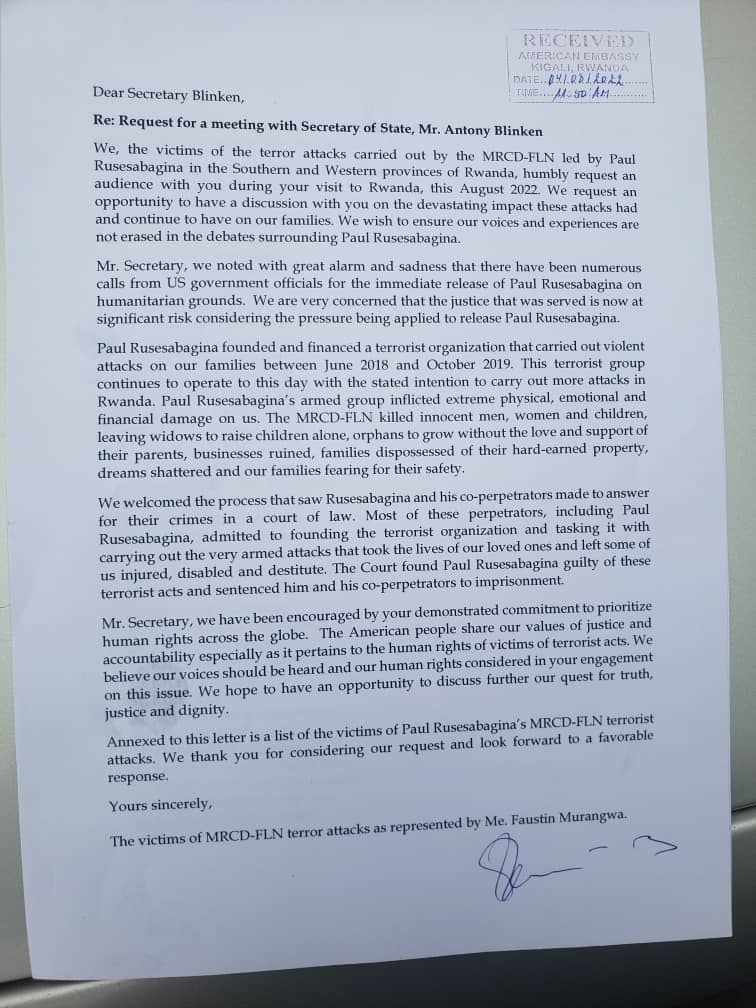 Ibaruwa yandikiwe Blinken igashyikirizwa Ambasade ya Amerika mu Rwanda ku itariki ya 04 Kanama 2022 igira iti “Turasaba amahirwe yo kuganira nawe ku ngaruka zikomeye ibi bitero byagize kandi bikomeje kugira ku miryango yacu. Twizeye ko ijwi ryacu n’ibyo twabonye bitakwirengagizwa mu bizaganirwa kuri Paul Rusesabagina.”