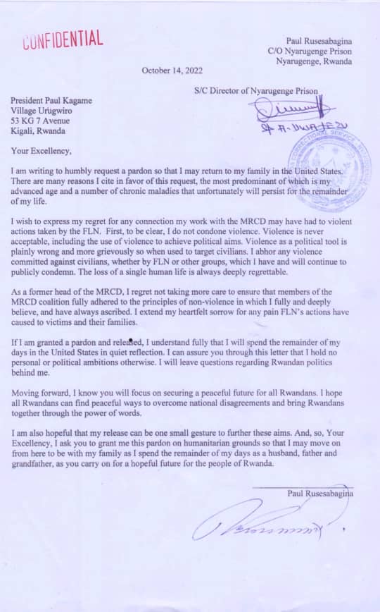 Ibaruwa Rusesabagina yanditse asaba imbabazi: