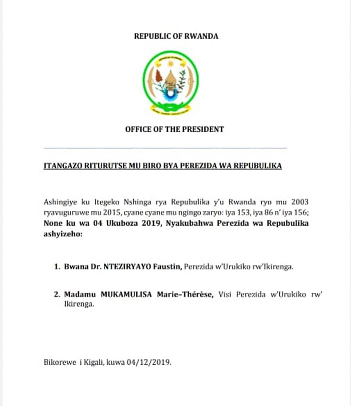 Ashingiye ku itegeko nshinga rya Repubulika y’u Rwanda ryo mu 2003 ryavuguruwe mu 2015, cyane cyane mu ngingo zaryo: iya 153, iya 86 n’ iya 156; kuri uyu wa gatatu tariki ya 04/12/2019, Perezida wa Repubulika y’u Rwanda Paul Kagame yashyizeho Dr. Nteziryayo Faustin, Perezida w’Urukiko rw’Ikirenga, na Marie Thérèse Mukamulisa, visi perezida w’Urukiko rw’Ikirenga.