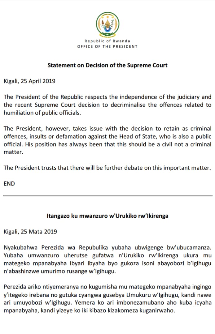 Ubutabera mu Rwanda nta bwigenge bufite niyo mpamvu Urukiko rw’ikirenga rutari kwibeshya ngo ruhindure iriya ngingo yo gutuka cg gusebya umukuru w’igihugu. Nabo babikoze babizi ko ataribyo. None dore office ya perezida irabavuguruje. Igisekeje ubu bagiye kwinyuza hirya no hino birangire babikosoye. Ubutabera bwo mu Rwanda bwari bukwiye kugendera ku mategeko aranga ubutabera bukareka gukorera munsi ya leta. Kandi bukwiye kwigenga.