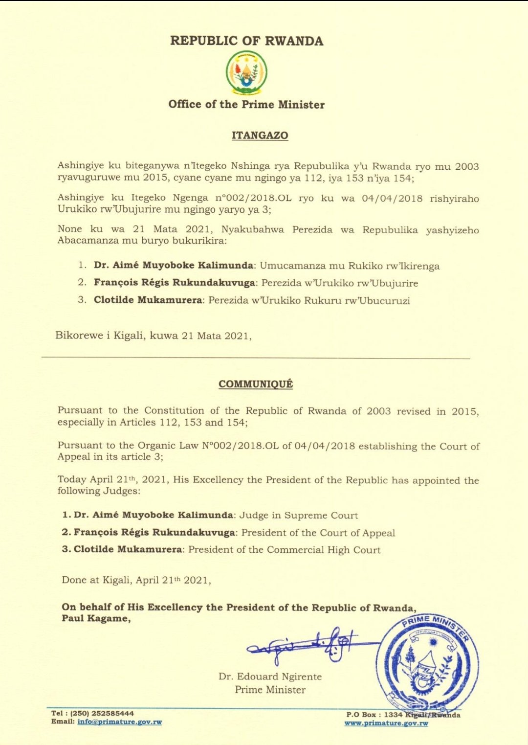 Perezida Kagame yagize Dr. Aimé Muyoboke Kalimunda Umucamanza mu Rukiko rw’Ikirenga, François Régis Rukundakuvuga, Perezida w’Urukiko rw’Ubujurire na Clotilde Mukamurera Perezida w’Urukiko Rukuru rw’Ubucuruzi.