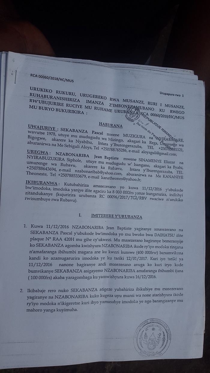 Ni ikibazo cyageze mu rukiko rwisumbuye rwa Rubavu, Sekabanza aratsindwa ndetse ategekwa gusubiza imodoka no kwishyura Nzabonariba amafaranga y’ubukode bwayo miliyoni esheshatu n’ibihumbi 900, indishyi z’akababaro zingana n’ibihumbi 500Frw, n’igihembo cy’umwunganizi mu mategeko kingana n’ibihumbi 500Frw.