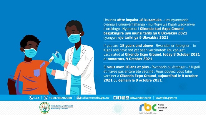 Ni impuruza yashyizwe kuri twitter ya RBC igira iti "Umuntu ufite imyaka 18 kuzamuka – umunyarwanda cyangwa umunyamahanga – mu Mujyi wa Kigali wacikanwe n’urukingo: Nyarukira i Gikondo kuri Expo Ground bagukingire uyu munsi tariki ya 8 Ukwakira 2021 cyangwa ejo tariki ya 9 Ukwakira 2021."