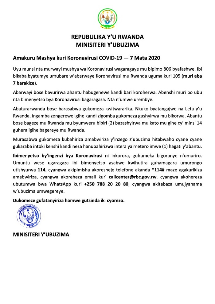 Ibi byatumye umubare w’abarwaye Coronavirus mu Rwanda uguma ku bantu 105, barindwi muri aba, bakaba barakize nk’uko itangazo rya MINISANTE ribivuga.