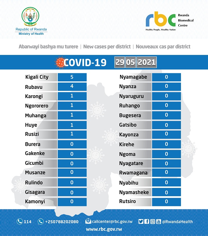 Minisiteri y’Ubuzima (MINISANTE) yatangaje ko ku wa Gatandatu tariki 29 Gicurasi 2021, mu Rwanda abantu 60 bakize Covid-19. Abayanduye ni 14 bituma umubare w’abamaze kwandura bose hamwe uba abantu 26,892. Abakirwaye bose hamwe ni 938 mu gihe abarembye ari batanu.
