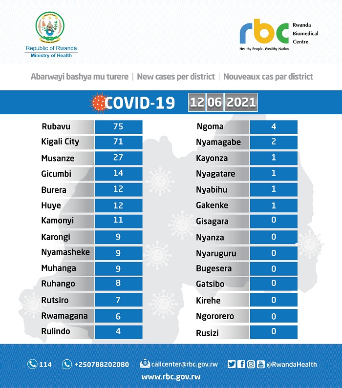 Minisiteri y’Ubuzima (MINISANTE) mu Rwanda, yihanganishije umuryango w’umugore w’imyaka 67 witabye Imana (ku Kamonyi) n’uw’umugabo w’imyaka 73 witabye Imana i Huye bazize Covid-19. Iyo Minisiteri yanatangaje ko ku wa Gatandatu tariki 12 Kamena 2021, mu Rwanda abantu 284 banduye Covid-19, bituma umubare w’abamaze kwandura bose uba 28,146. Kuri iyo tariki nta muntu wakize icyo cyorezo.