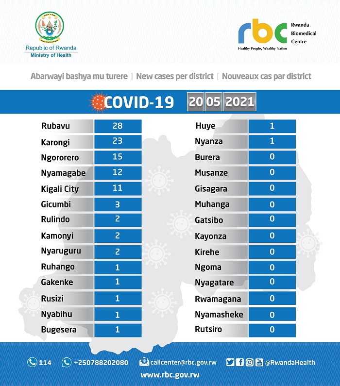 Minisiteri y’Ubuzima (MINISANTE) yatangaje ko ku wa Kane tariki 20 Gicurasi 2021, mu Rwanda abantu 76 bakize Covid-19. Abayanduye ni 105 bituma umubare w’abamaze kwandura bose hamwe uba abantu 26,529. Abakirwaye bose hamwe ni 1,296.