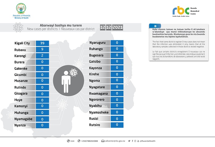 Minisiteri y’Ubuzima (MINISANTE) yatangaje ko ku Cyumweru tariki 12 Ukuboza 2021 mu Rwanda habonetse abanduye Covid-19 bashya 50, bakaba babonetse mu bipimo 22,514.