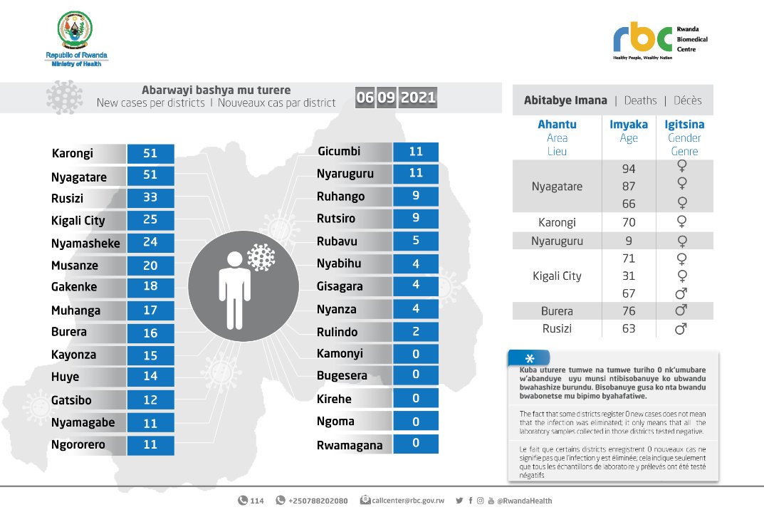 Minisiteri y’Ubuzima yatangaje ko ku wa Mbere tariki 6 Nzeri 2021 mu Rwanda habonetse abanduye Covid-19 bashya 244, bakaba babonetse mu bipimo 12,180.