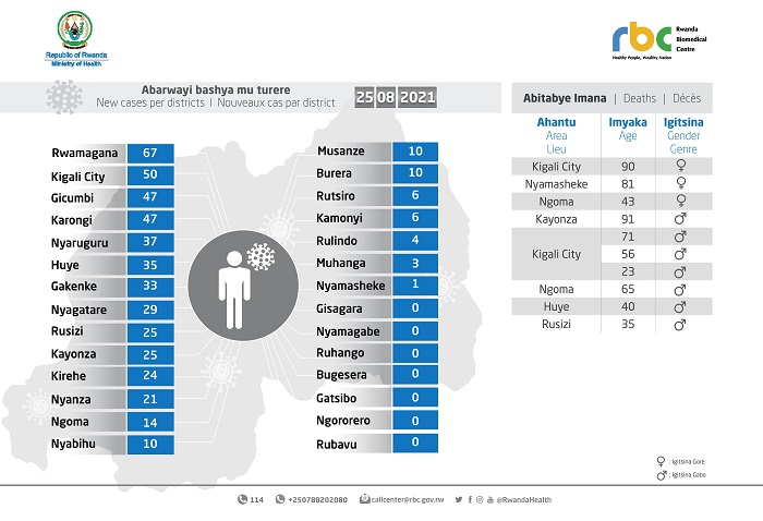 Minisiteri y’Ubuzima yatangaje ko ku wa Gatatu tariki 25 Kanama 2021 mu Rwanda habonetse abanduye Covid-19 bashya 504 bakaba babonetse mu bipimo 12,845.