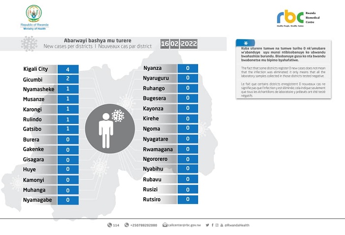 Minisiteri y’Ubuzima (MINISANTE) yatangaje ko ku wa Gatatu tariki 16 Gashyantare 2022 mu Rwanda habonetse abanduye Covid-19 bashya 11, bakaba babonetse mu bipimo 9,935.