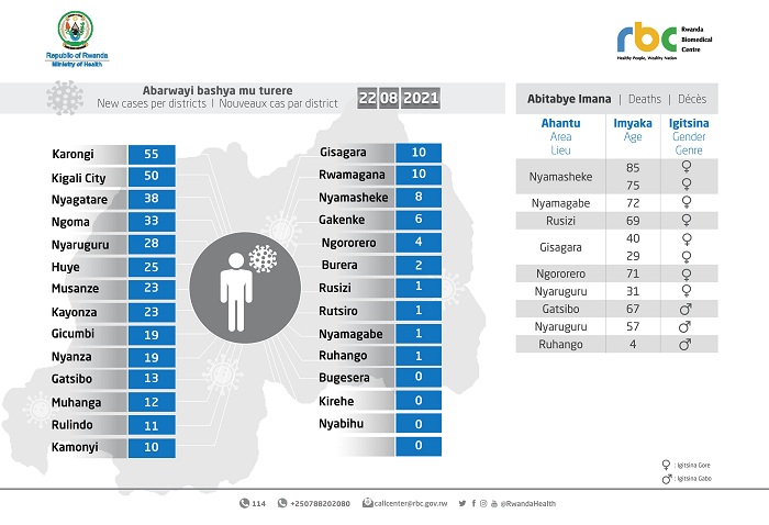 Minisiteri y’Ubuzima (MINISANTE) yatangaje ko ku Cyumweru tariki 22 Kanama 2021 mu Rwanda abantu 11 bitabye Imana bazize Covid-19, abanduye bashya ni 393 babonetse mu bipimo 12,650.