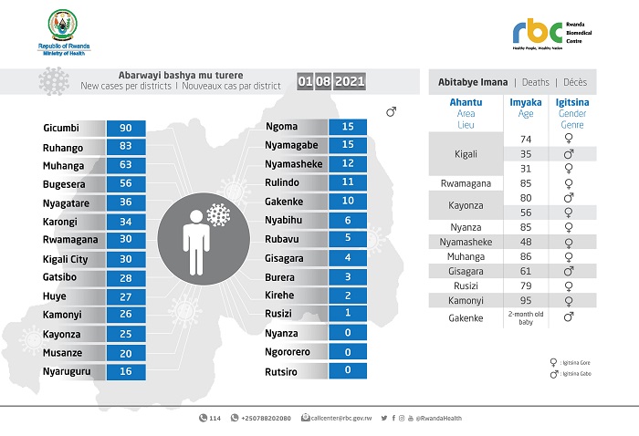Minisiteri y’Ubuzima yatangaje ko ku Cyumweru tariki 01 Kanama 2021 mu Rwanda habonetse abanduye Covid-19 bashya 648 bakaba babonetse mu bipimo 7,614. Abantu 13 bitabye Imana kubera icyo cyorezo, bituma umubare w’abamaze gupfa bose uba 821. Abitabye Imana ni abagore 9 n’abagabo 4.