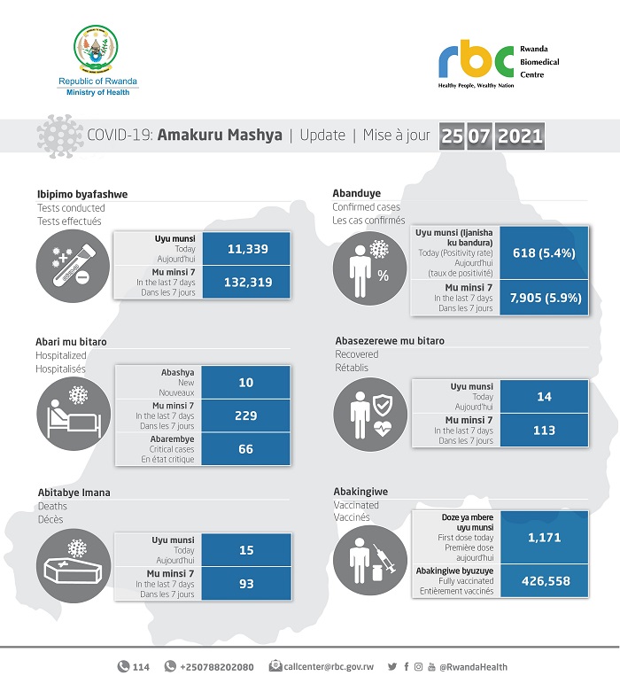 Minisiteri y’Ubuzima yatangaje ko ku Cyumweru tariki 25 Nyakanga 2021 mu Rwanda hafashwe ibipimo 11,339 bibonekamo abanduye 618. Abantu 10 bashyizwe mu mitaro, mu gihe abasezerewe mu bitaro ari 14.