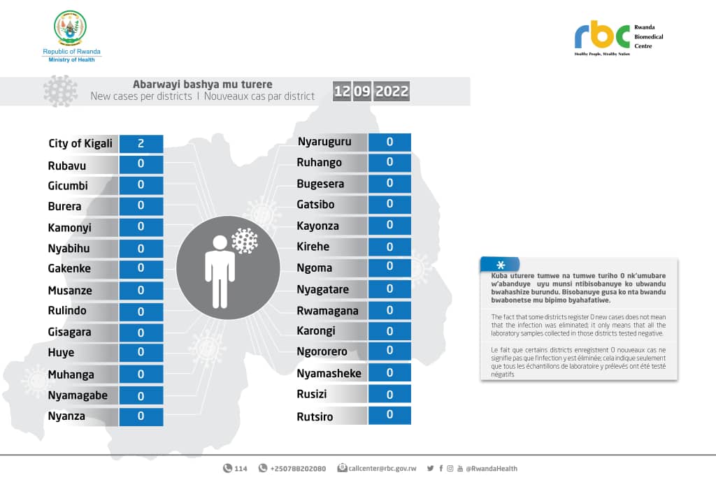 Minisiteri y’Ubuzima (MINISANTE) yatangaje ko ku wa Mbere tariki 12 Nzeri 2022 mu Rwanda habonetse abantu 2 banduye Covid-19 bakaba barabonetse mu bipimo 1,570.