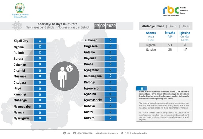 Minisiteri y’Ubuzima (MINISANTE) yatangaje ko ku wa Kane tariki 17 Gashyantare 2022 mu Rwanda habonetse abanduye Covid-19 bashya 8, bakaba babonetse mu bipimo 10,530.
