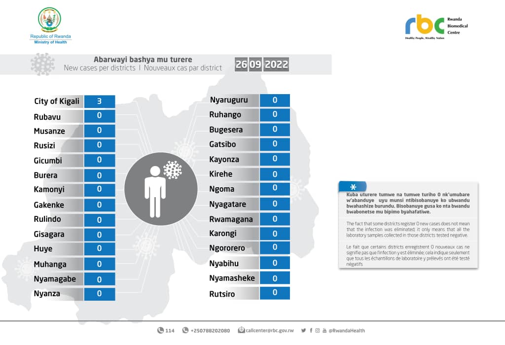Minisiteri y’Ubuzima (MINISANTE) yatangaje ko ku wa Mbere tariki 26 Nzeri 2022 mu Rwanda habonetse abantu 8 banduye Covid-19 bakaba barabonetse mu bipimo 1,967.