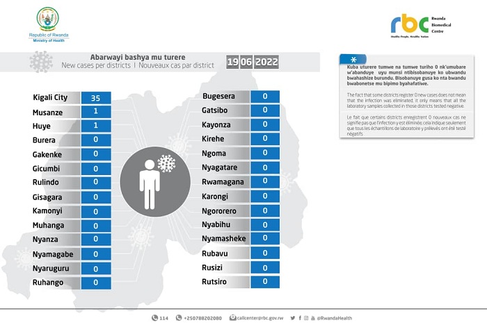 Minisiteri y’Ubuzima (MINISANTE) yatangaje ko ku Cyumweru tariki 19 Kamena 2022 mu Rwanda habonetse abanduye Covid-19 bashya 37, bakaba babonetse mu bipimo 5.778.