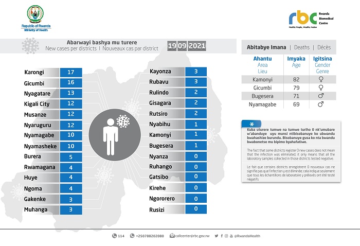 Minisiteri y’Ubuzima (MINISANTE) yatangaje ko ku Cyumweru tariki 19 Nzeri 2021 mu Rwanda habonetse abanduye Covid-19 bashya 140, bakaba babonetse mu bipimo 5,447.