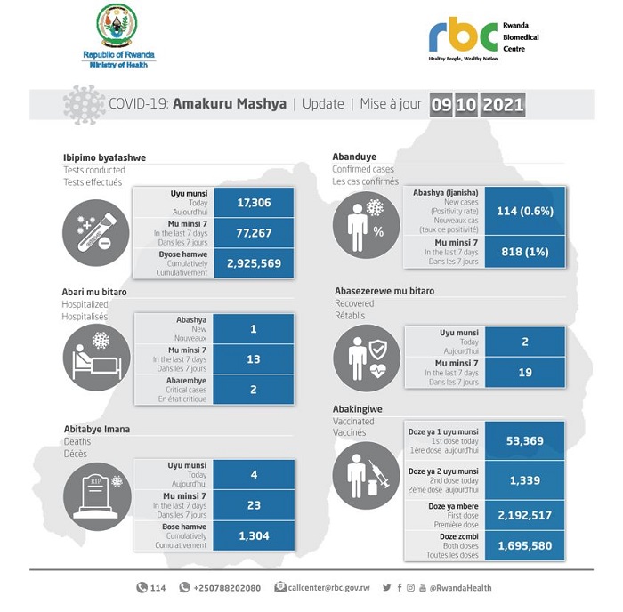 Minisiteri y’Ubuzima (MINISANTE) yatangaje ko ku wa Gatandatu tariki 09 Ukwakira 2021 mu Rwanda habonetse abanduye Covid-19 bashya 114, bakaba babonetse mu bipimo 17,306.