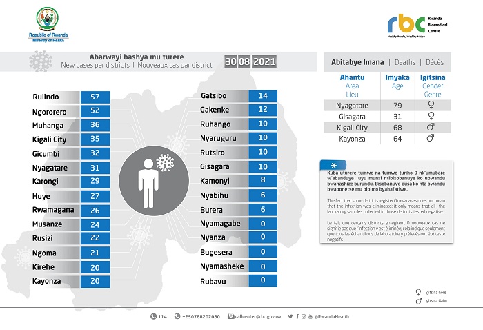 Minisiteri y’Ubuzima yatangaje ko ku wa Mbere tariki 30 Kanama 2021 mu Rwanda habonetse abanduye Covid-19 bashya 518 bakaba babonetse mu bipimo 8,766.