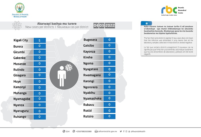 Minisiteri y’Ubuzima (MINISANTE) yatangaje ko ku wa Gatanu tariki 04 Werurwe 2022 mu Rwanda habonetse abanduye Covid-19 bashya 5, bakaba babonetse mu bipimo 14,283.