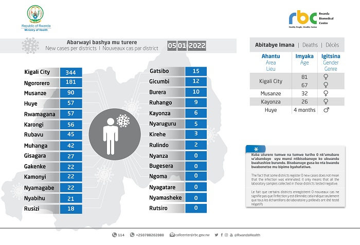 Minisiteri y’Ubuzima (MINISANTE) yatangaje ko ku wa Gatatu tariki 5 Mutarama 2022 mu Rwanda habonetse abanduye Covid-19 bashya 1,066 bakaba babonetse mu bipimo 22,883.