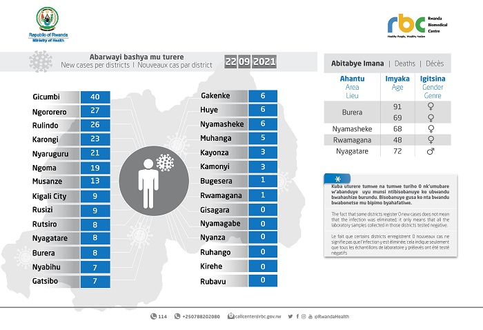 Minisiteri y’Ubuzima (MINISANTE) yatangaje ko ku wa Gatatu tariki 22 Nzeri 2021 mu Rwanda habonetse abanduye Covid-19 bashya 256, bakaba babonetse mu bipimo 9,431.