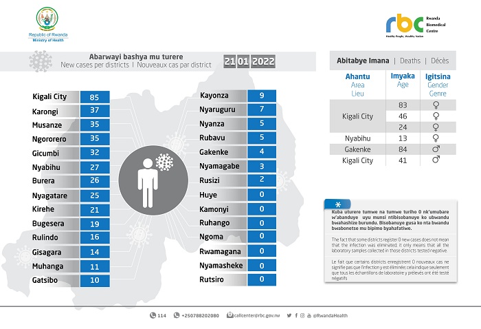 Minisiteri y’Ubuzima (MINISANTE) yatangaje ko ku wa Gatanu tariki 21 Mutarama 2022 mu Rwanda habonetse abanduye Covid-19 bashya 428, bakaba babonetse mu bipimo 15,432.