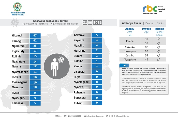 Minisiteri y’Ubuzima (MINISANTE) yatangaje ko ku wa Kabiri tariki 21 Nzeri 2021 mu Rwanda habonetse abanduye Covid-19 bashya 264, bakaba babonetse mu bipimo 10,186.