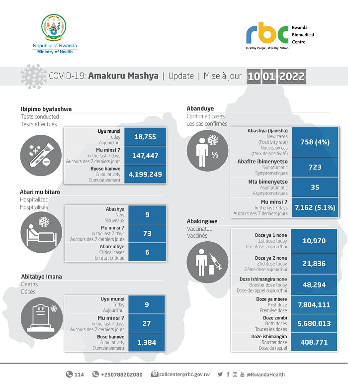 Minisiteri y’Ubuzima (MINISANTE) yatangaje ko ku wa Mbere tariki 10 Mutarama 2022 mu Rwanda habonetse abanduye Covid-19 bashya 758, bakaba babonetse mu bipimo 18,755.