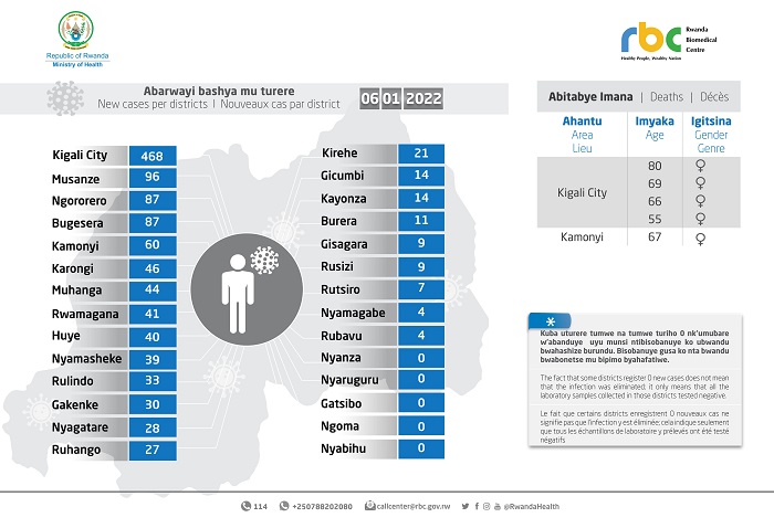 Abitabye Imana ni abagore batanu, barimo bane bo mu mujyi wa Kigali n’umwe wo mu Karere ka Kamonyi. Abamaze guhitanwa na Covid-19 muri rusange mu Rwanda ni 1,367.