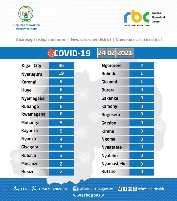 Minisiteri y’Ubuzima (MINISANTE) yatangaje ko ku wa Gatatu tariki 24 Gashyantare 2021, mu Rwanda umuntu umwe yitabye Imana yishwe na COVID-19. Habonetse abanduye bashya 118, naho abakize ni 13.