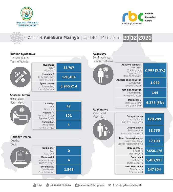 Nta wishwe na Covid-19 mu gihugu kuri uwo munsi. Abashyizwe mu bitaro bashya ni 47, abarembye ni 5 nk’uko imibare yatangajwe ibigaragaza.