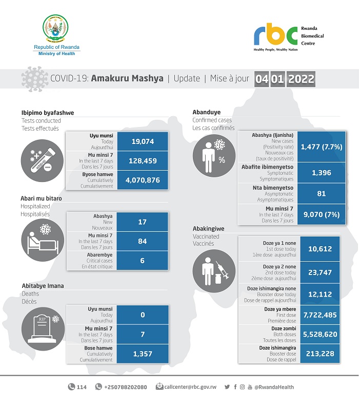 Minisiteri y’Ubuzima (MINISANTE) yatangaje ko ku wa Kabiri tariki 4 Mutarama 2022 mu Rwanda habonetse abanduye Covid-19 bashya 1,477 bakaba babonetse mu bipimo 19,074.